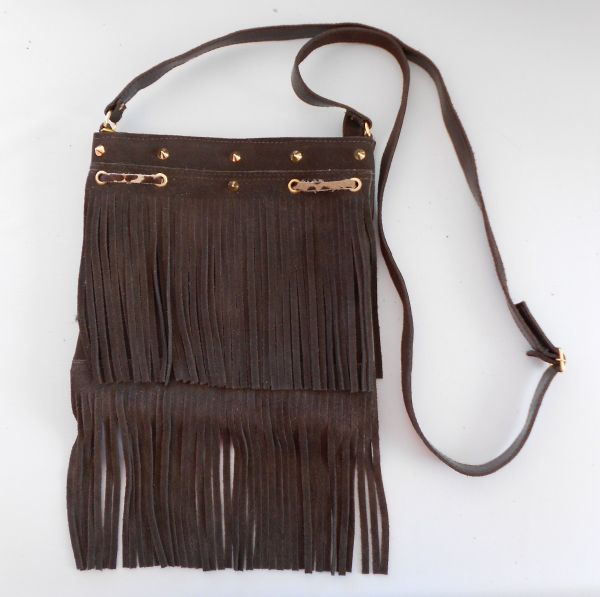Bolsa com franja de couro natural tamanho médio com detalhe de onça e spike.